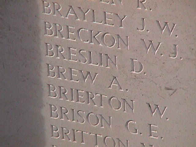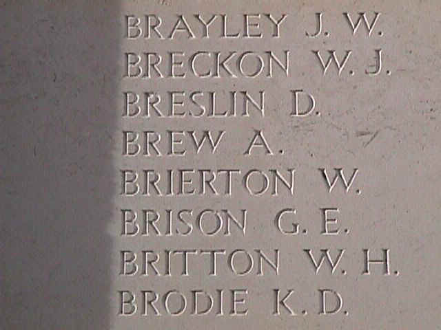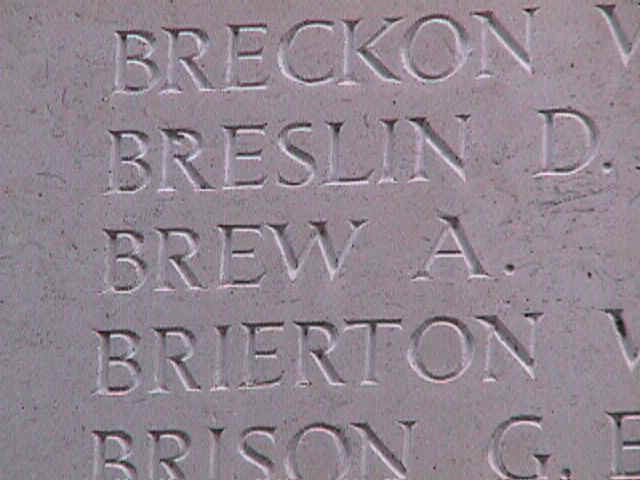 The War Memorial of Private 16406 Arthur John Brew, 7th Battalion Canadian Infantry, British Columbia Regiment, who was killed on 24 April 1915, is located on Panel 28 on the eastern side of the Ypres Menin Gate Memorial in Ieper, Belgium. He was born in Whitehaven, England, on 12 October 1890 and enlisted on 18 September 1914.