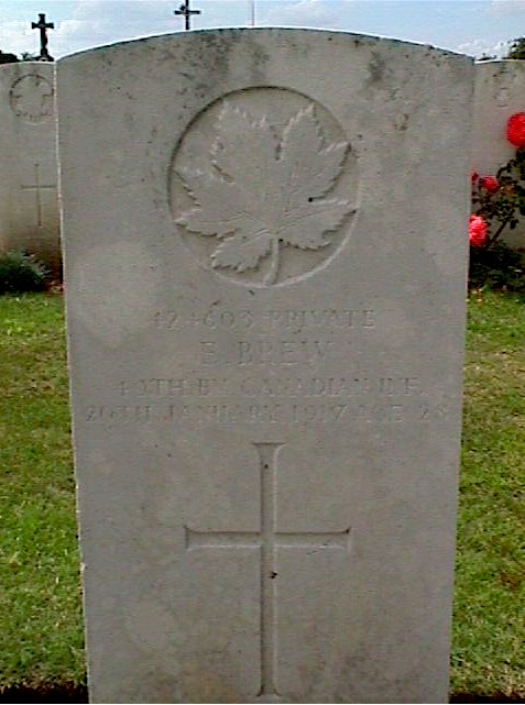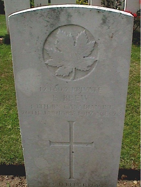 The war grave of Private Ernest Brew, 49th Battalion Canadian Infantry (Alberta Regiment), who died on 20 January 1917, aged 29, is located in Aubigny Communal Cemetery Extension, Pas de Calais, France (Grave I, F33). Ernest, who was the son of William and Elizabeth Brew of 14 Brewery Lane, Egremont, Cumberland, England, was born on 6 January 1887 in Ponsonby, Cumberland.